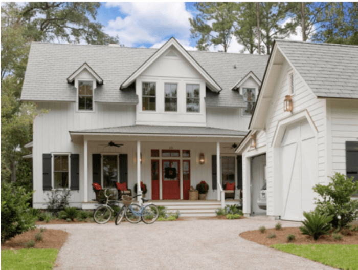 • Add outdoor lighting fixtures to illuminate the landscaping and highlight the white siding at night.
